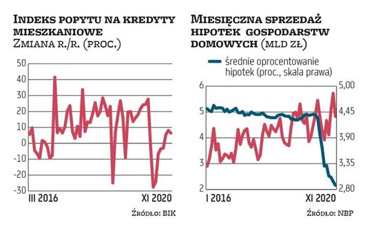 Banki mają duże oczekiwania co do sprzedaży kredytów mieszkaniowych. Sporo ważą one w ich bilansach i były w 2020 r. jedynym rodzajem produktów kredytowych, których sprzedaż wyraźnie rosła. Przedstawiciele PKO BP wskazują, że liczą nawet na dwucyfrowe tempo wzrostu sprzedaży hipotek w tym roku. Spora nadpłynność i wysokie kapitały banków powodują, że mają one dużą zdolność do zwiększania akcji kredytowej. Dodatkowo stopy procentowe są blisko zera, na historycznie niskich poziomach, a średnie wynagrodzenie Polaków nadal rośnie, więc zwiększa się także zdolność kredytowa. Jednak i tak niektórzy klienci mogą napotkać problem w zakresie podaży. Banki na początku pandemii zaostrzyły politykę kredytową i choć latem ją wyraźnie poluzowały, to jednak wciąż sporo z nich nie udziela kredytów mieszkaniowych osobom, które nie mają umowy o pracę (lecz jedynie zlecenie lub dzieło) lub które pracują w branżach najbardziej narażonych na skutki pandemii. MR