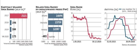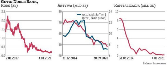 Skrajnie odmienne nastroje mają inwestorzy Idea Banku. Akcje tej spółki zostały umorzone i nie można już nimi handlować. Przed tą operacją kapitał banku dzielił się na 78,4 mln walorów, ostatnio kurs wynosił 1,59 zł, co dawało 125 mln zł kapitalizacji. W rękach inwestorów mniejszościowych znajdowało się 26 proc., czyli 20,4 mln akcji wartych ostatnio 32 mln zł. Bank kontrolowany był przez Leszka Czarneckiego. Bezpośrednio biznesmen miał 9,8 proc. akcji, zaś zależne od niego Getin Noble i Getin Holding odpowiednio 10 proc. i 54,4 proc. Notowania obu tych spółek w poniedziałek spadały. Ucierpieli również wierzyciele, bo umorzono obligacje podporządkowane warte 56 mln zł.