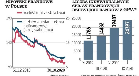 Z pewnością nie wszyscy, bo część frankowiczów mimo wszystko zechce walczyć o większą korzyść w sądach i dołączy do około 32 tys. spraw tego typu toczących się w Polsce. To stan na koniec września, liczba ta stanowi około 7,5 proc. czynnych kredytów. NBP podał, że na koniec czerwca udział frankowych hipotek objętych pozwami to 10 proc. całej wartości tych kredytów. Wpływ na dalszą skłonność klientów do pozywania banków będą miały m.in. warunki proponowanych ugód oraz oczekiwane orzeczenie Sądu Najwyższego w sprawie frankowej dotyczące głównie opłat za korzystanie z kapitału w razie unieważnienia umowy, które zdecyduje, czy dla klientów spór sądowy będzie korzystniejszy niż ugoda.