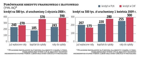 Jaka jest propozycja KNF dla klientów? Zakłada ona, że klient mógłby „zamienić" frankowy kredyt na złotowy, który zaciągnięty byłby na warunkach, jakie wtedy oferowano. Gdyby uznał, że to dla niego opłacalne, po operacji miałby kredyt złotowy z oprocentowaniem według stawki WIBOR. Wprawdzie stopy w Polsce są niskie (WIBOR wynosi 0,22 proc.), ale nie tak niskie jak w Szwajcarii (LIBOR wynosi -0,78 proc.). Zatem kapitał kredytu musiałby po konwersji istotnie spaść, aby miesięczne raty nie urosły, więc najkorzystniejsze to rozwiązanie będzie dla tych, którzy brali kredyt przy najniższym kursie franka. O ile jeszcze pięć lat temu, gdy toczyły się dyskusje o ustawie, różnica w zapłaconych już ratach przemawiała często na korzyść frankowiczów, to teraz, po latach wysokiego kursu szwajcarskiej waluty, lepiej wypadają klienci złotowi. Weźmy pod lupę modelowe kredyty udzielone w styczniu 2008 r. na 30 lat i równowartość 300 tys. zł przy kursie 2,25 zł, z marżą 1,3 proc. i spreadem 2,2 proc. Do tej pory frankowicz spłacił niecałe 270 tys. zł rat, ale pozostało mu jeszcze ponad 370 tys. zł wartości bilansowej, czyli przy utrzymaniu obecnego kursu franka w okolicach 4,14 zł do końca kredytu spłaciłby jeszcze łącznie aż 390 tys. zł rat. Złotowy kredytobiorca spłacił 240 tys. zł rat, wartość kapitału do spłaty to 185 tys. zł, więc przy założeniu stabilnej stawki WIBOR spłaci jeszcze 243 tys. zł rat. „Zamiana" kredytu spowodowałaby, że kapitał pozostający do spłaty zmalałby o 185 tys. zł, klient mógłby też zyskać ok. 30 tys. zł nadpłaconych rat. Jeśli jednak taki sam kredyt na 300 tys. zł zaciągnięty był rok później przy kursie bliskim 3 zł, zapłacone przez frankowicza raty to 173 tys. zł, a do spłaty ma 280 tys. zł kapitału (złotowicz odpowiednio 207 tys. zł i 220 tys. zł). Zatem korzyść kapitałowa przy „zamianie" wyniosłaby tylko 60 tys. zł, a raty w złotych byłyby wyższe o 34 tys. zł. Frankowicz uwolniłby się jednak od czekających go jeszcze rat rzędu prawie 300 tys. zł (255 tys. zł w złotowym). MR