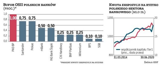 Bufor OSII rzędu 0,5 proc. (poza wspomnianym mBankiem) nadal ma ING Bank Śląski, co powoduje, że jego wymogi kapitałowe wciąż podwyższane są z tego powodu o około 440 mln zł. Na koniec III kwartału ING BSK miał 18,6 mld zł kapitałów własnych. Po 0,25 proc. bufora mają BNP Paribas i Handlowy, co „kosztuje" je pod względem wymogu kapitałowego odpowiednio 200 mln zł i około 70 mln zł.