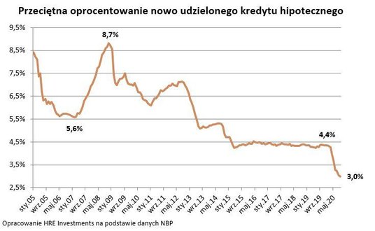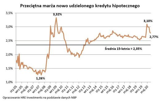 Z danych tych można wywnioskować, że marża kredytowa, którą banki doliczają do stawki WIBOR, wyniosła we wrześniu około 2,84 proc., nieco mniej niż w sierpniu (2,87 proc.). Spadek łącznego oprocentowania nowych hipotek do 3,1 proc. to głównie efekt cięcia stóp procentowych, które wiosną zostały obniżone o 1,4 pkt proc., co sprowadziło WIBOR 3M do 0,22 proc. z 1,71 proc. przed cięciami rozpoczętymi w drugiej połowie marca. Obecna marża (2,84 proc.) jest tylko nieco wyższa od tej sprzed pandemii (2,68 proc. w lutym).
