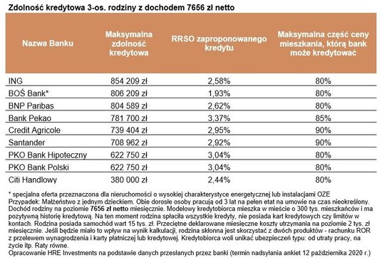 Banki różnią się pod względem ofert. W październiku najhojniejszy bank skłonny jest pożyczyć naszej modelowej rodzinie nawet ponad dwa razy więcej niż instytucja najbardziej zachowawcza. Citi Handlowy proponuje naszej modelowej rodzinie 380 tysięcy złotych kredytu. Jeśli dług zaciągany byłby z 20-proc. wkładem własnym, to dzięki niemu można byłoby kupić mieszkanie warte 475 tys. złotych. Na drugim biegunie znajdziemy takie instytucje jak ING, BOŚ czy BNP Paribas., które skłonne byłyby pożyczyć naszej familii nawet ponad 800 tysięcy złotych na zakup mieszkania.