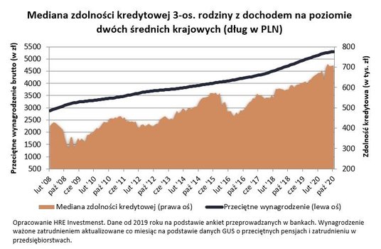 W badanym przez przykładzie rodzina nie ma zobowiązań finansowych, ale posiada już pozytywną historię kredytową. Oboje rodzice mają pracę, a ich pensje zostały oszacowane na podstawie danych GUS o pensjach w sektorze przedsiębiorstw. Niestety dane urzędowe pomijają umowy o dzieło czy zlecenie, ale też pensje w małych firmach i administracji publicznej. W sumie oznacza to, że urzędowa średnia jest trochę zawyżona. Gdyby spróbować to zniwelować poprzez obniżenie średniej krajowej o 20 proc., to i tak wciąż mielibyśmy do czynienia z całkiem solidną zdolnością kredytową. Przeciętnie nasza rodzina mogłaby bowiem pożyczyć na mieszkanie w ramach 30-letniego kredytu 510 tysięcy złotych – wynika z danych HRE Investments.