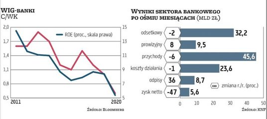 Wyniki sektora bankowego za sierpień przyniosły pozytywne zaskoczenie, ale są obawy o ich powtarzalność. Szczególnie że rośnie ryzyko zaostrzenia ograniczeń pandemicznych, na czym ucierpiałyby firmy i klienci indywidualni. – Jeśli gospodarka odbije, a na to się raczej nie zanosi, banki także powinny się dobrze zachowywać. Ich akcje mają nad innymi sektorami swoistą przewagę – nie wzrosły w czasie odbicia. Ponowne lockdowny mocno zdołują ceny wielu spółek, a na banki będą już miały mniejszy wpływ, bo ceny szorują po dnie przy w sumie nie tak złych jak na obecne wyceny giełdowe wynikach. Gdyby udało się opanować epidemię, ceny banków mogą wystrzelić – uważa Materna. Jego zdaniem z portfelowego punktu widzenia może być tak, że lepiej mieć akcje banków, które nie pokazały jeszcze aż tak złych wyników na skutek pandemii, niż np. spółek przemysłowych czy handlowych.