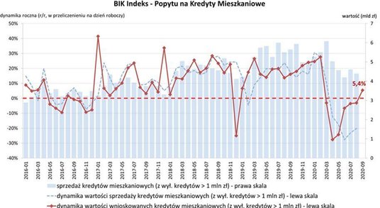 Wartość BIK Indeksu Popytu na Kredyty Mieszkaniowe wyniosła we wrześniu 5,4 proc., w co oznacza, że w przeliczeniu na dzień roboczy banki i SKOK-i przesłały do BIK zapytania o kredyty mieszkaniowe na kwotę większą o 5,4 proc. niż rok temu – wynika z danych Biura Informacji Kredytowej.