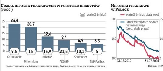 Spłacalność hipotek frankowych wciąż jest całkiem dobra, choć bankowcy obawiają się, że pandemia (umocnienie kursu CHF, pogorszenie sytuacji na rynku pracy, wakacje kredytowe) ją pogorszy. Głównym powodem prób zawarcia przez banki porozumień z klientami są kwestie prawne: w ostatnich miesiącach liczba pozwów kierowanych do sądów przeciw bankom (ostatnio tylko przez kwartał toczących się spraw przybyło o 35 proc.) i rosnący już udział spraw wygrywanych przez klientów (w ostatnich miesiącach sięgał 80–90 proc.).