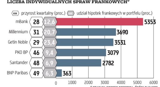 Przeciw sześciu największym „frankowym" bankom z GPW (PKO BP, Santander, mBank, Getin Noble, Millennium, BNP Paribas) na koniec czerwca toczyło się łącznie już 18,8 tys. indywidualnych spraw wytoczonych przez klientów mających kredyty mieszkaniowe – wynika z naszego podsumowania na podstawie raportów banków. Oznacza to, że przez trzy miesiące przybyło netto (nowe sprawy minus rozstrzygnięte) blisko 4,85 tys. spraw, czyli prawie 35 proc. To wzrost jeszcze szybszy niż w I kwartale, gdy analizowanej szóstce przybyło w porównaniu z końcem 2019 r. łącznie 2,6 tys. spraw, co oznaczało wzrost o 23 proc.