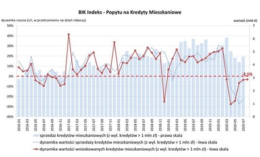 Wartość BIK Indeksu Popytu na Kredyty Mieszkaniowe wyniosła lipcu -3,1 proc., w co oznacza, że w przeliczeniu na dzień roboczy banki i SKOK-i przesłały do BIK zapytania o kredyty mieszkaniowe na kwotę mniejszą o 3,1 proc. niż rok temu – wynika z danych Biura Informacji Kredytowej.