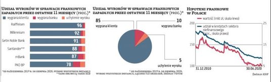 Wzięliśmy pod lupę sytuację poszczególnych banków, najbardziej zaangażowanych w te sporne kredyty. Przez ostatnie 11 miesięcy najwyższy wskaźnik przegrywanych spraw miały Raiffeisen (96 proc., wygrał 3 proc., reszta to uchylenia poprzednich wyroków), Millennium (92 proc., wygrał tylko 4 proc.) oraz Getin Noble Bank (91 proc., wygrał tylko 2 proc.). W Santander Banku Polska było to 88 proc., grupa wygrała 6 proc. rozstrzygniętych sporów z klientami w tym czasie (dane obejmują również Santander Consumer Bank, który zanotował 11 porażek, czyli przegrał we wszystkich wyrokach, do których udało nam się dotrzeć). W mBanku wskaźnik przegranych przez niego spraw to 87 proc., korzystne zaś było dla niego 10 proc. zapadłych dotąd wyroków. Najlepiej wypadł PKO BP, dla którego wskaźniki te wyniosły odpowiednio 78 proc. i 13 proc.