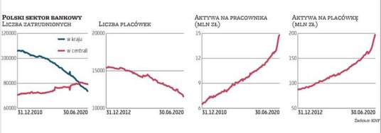 Na koniec czerwca w polskim sektorze bankowym było łącznie 11,7 tys. oddziałów (w tym także filii, przedstawicielstw i innych). To o ponad 3,5 tys. mniej (prawie 25 proc.) niż na koniec 2012 r., gdy KNF zmieniła metodologię liczenia placówek. Tylko przez ostatni rok ubyło 861 oddziałów, czyli sieć skurczyła się o blisko 7 proc. W ślad za kurczącą się siecią tradycyjnych placówek maleje liczba zatrudnionych. Na koniec czerwca w sektorze było 153,5 tys. etatów, to o 23,4 tys. mniej (ponad 13 proc.) niż na koniec 2010 r. (w szczytowym momencie w połowie 2011 r. było 178 tys. etatów). Tylko przez rok w polskiej bankowości ubyło 6,4 tys. miejsc pracy, czyli liczba zatrudnionych zmalała w tym czasie o 4 proc.