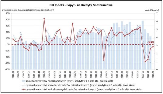 - Na wartość indeksu popytu na kredyty mieszkaniowe negatywnie wpłynął spadek liczby wnioskodawców, pozytywnie natomiast wzrost średniej kwoty wnioskowanego kredytu. W lipcu kontynuowany był proces odmrażania gospodarki, zapoczątkowany w maju. Odczyt lipcowy indeksu, pomimo, że nadal jest ujemny i daleko mu do odczytu lutowego br. (+27,6 proc.), który zakończył wzrostowy trend popytu na kredyty mieszkaniowe, jest już kolejnym po czerwcu wskazaniem odbudowy popytu na rynku kredytów mieszkaniowych. Otwartym pytaniem pozostaje, na jak długo. Na razie mamy swoisty rollercoaster: w lutym – euforia, w kwietniu – głęboka depresja, w maju lekka poprawa, w czerwcu wyraźna poprawa, która jest kontynuowana w lipcu. Nadal jednak jest prawdopodobny scenariusz drugiej fazy pandemii na jesieni – mówi prof. Waldemar Rogowski, główny analityk BIK.