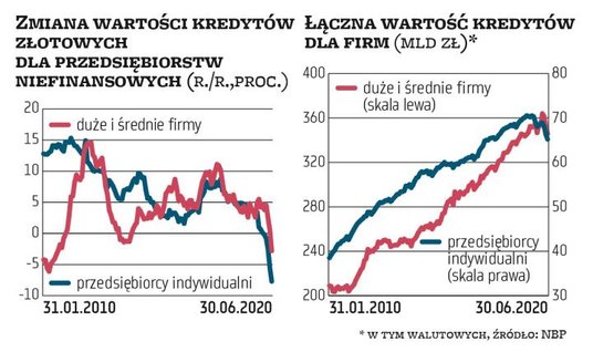 W czerwcu, po raz pierwszy od lutego 2011 r., spadła wartość kredytów dla dużych przedsiębiorstw i MŚP o 1 proc. rok do roku oraz indywidualnych o 7,9 proc., najmocniej od 17 lat (dane skorygowane o efekt zmian kursów walut).