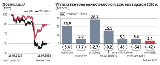 W samym maju sektor miał nieco ponad 1 mld zł zysku (spadek o 36 proc. rok do roku spowodowany wzrostem rezerw). To taki sam zysk jak w kwietniu, ale wynik okazał się znacznie lepszy niż 300 mln zł straty netto z marca spowodowanej dużym wzrostem rezerw (głównie ze względu na modelowe rezerwy wynikające z pandemii). Widać już jednak spadek, choć wciąż niewielki, wyniku z odsetek, co źle wróży temu rezultatowi w kolejnych miesiącach, biorąc pod uwagę najbardziej bolesną dla banków obniżkę stóp z końca maja oraz fakt, że dostosowanie oprocentowania kredytów do nowej stopy WIBOR zajmuje zwykle parę miesięcy (oznacza to, że pełny negatywny wpływ na przychody odsetkowe widoczny będzie dopiero pod koniec III kwartału). Z kolei po stronie cięcia kosztów finansowania banki wyczerpały już większość możliwości, bo największe z nich od kilku miesięcy oferują nowe lokaty oprocentowane na zero lub na kilka promili (pewne oszczędności przynosi jeszcze zamknięcie starszych lokat, założonych przed cięciem stóp).