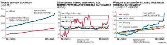 Przede wszystkim chodzi o cięcie stóp procentowych (trzema obniżkami sprowadzono w trzy miesiące stopę referencyjną z 1,50 proc. do 0,1 proc.), które obniża klientom banków koszty obsługi długu (uderza to w dochody sektora), oraz skup przez NBP obligacji skarbowych i gwarantowanych przez państwo, a także emisję przez BGK i głównie PFR obligacji finansujących tzw. tarcze antykryzysowe i finansowe chroniące firmy (to zniekształca bilanse banków).