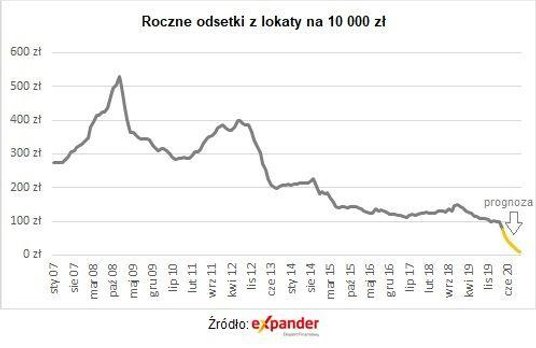 - Oprocentowanie w kolejnych miesiącach będzie niestety jeszcze niższe, gdyż w maju miała miejsce kolejna obniżka stóp procentowych NBP o 0,40 pkt proc. Za chwilę standardem może stać się stawka 0,1 proc. w skali roku, czyli tyle ile wynosi podstawowa stopa NBP. Już teraz część banków oferuje śmieszne oprocentowanie wynoszące zaledwie 0,01 proc. W takim przypadku roczna lokata na 10 000 zł daje zaledwie 0,81 zł odsetek – mówi Jarosław Sadowski, główny analityk Expandera.