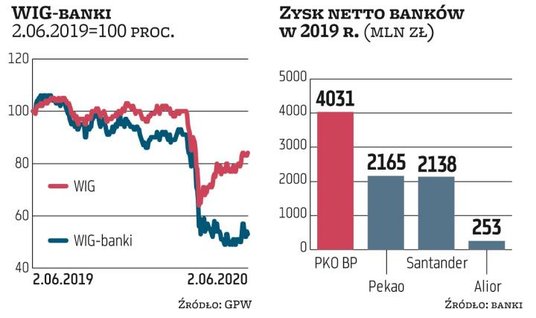 PKO BP ocenia, że negatywny wpływ tych trzech cięć na wynik netto sięgnie w tym roku 850–900 mln zł i uwidoczni się głównie w drugim półroczu (dotyczy to wszystkich banków, bo niemal w całym I kwartale stopa procentowa wynosiła 1,5 proc. i cięcia z marca, kwietnia i maja w pełnej skali wpłyną na wyniki kolejnych kwartałów). To sporo, bo w 2019 r. zysk netto PKO BP wyniósł 4,03 mld zł. Santander Bank Polska szacuje, że cięcia stóp obniżą w tym roku jego wynik odsetkowy o 635–700 mln zł, co może oznaczać, że wynik netto byłby niższy, niż gdyby cięć nie było, o 515–570 mln zł. Dla porównania w 2019 r. Santander miał 2,14 mld zł zysku netto. Według wyliczeń Pekao obniżki stóp obniżą wynik netto o 650–700 mln zł. Także w przypadku tego banku stanowi to około jednej czwartej ubiegłorocznego zysku netto (2,17 mld zł).