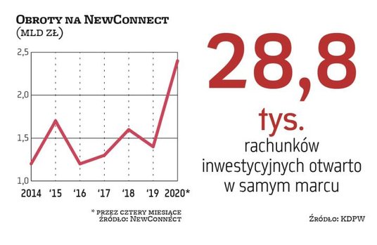 O renesansie inwestorów indywidualnych świadczy też aż 1,1 mld zł obrotów w kwietniu na NewConnect, czyli rynku przez nich zdominowanym. To o prawie 1200 proc. więcej niż rok wcześniej (w całym 2019 r. obroty wyniosły 1,4 mld zł). Czekając na dane kwietniowe, biura maklerskie informują, że trend był kontynuowany. Na przykład Pekao podaje, że w kwietniu nie zwolniło tempa – cały czas rosła liczba nowych rachunków, obserwowano również napływ aktywów. Wstępne wyniki z ubiegłego miesiąca w zakresie przychodów pokazują, że był to dla brokera bardzo dobry miesiąc – wręcz rekordowy. Kwietniowe odczyty wolumenu obrotu na akcjach, realizowanego za pośrednictwem Biura Maklerskiego Pekao, były w odniesieniu do marca wyższe o około 10 proc., a przecież już w samym marcu mieliśmy do czynienia ze 100-proc. wzrostem w porównaniu ze styczniem i lutym. Odzwierciedleniem tej sytuacji są udziały tego brokera w GPW, które wzrosły do ponad 3,3 proc. w całym rynku, a BM Pekao zakłada, że w segmencie detalicznym sięgnęły około 28 proc. MR