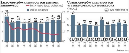 Gdyby tak się miało stać, w ogromnym stopniu obniżyłoby to zysk sektora, bo saldo odpisów musiałoby urosnąć z 9 mld zł w 2019 r. do 20 mld zł. Dla porównania wynik operacyjny sektora, czyli uwzględniający już koszty ryzyka i operacyjne, wyniósł 19,8 mld zł w 2019 r. W tym będzie na pewno niższy ze względu na cięcie stóp procentowych o 1 pkt proc., do 0,5 proc., oraz hamowanie akcji kredytowej.
