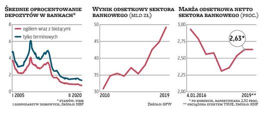 Jednak sztuacja jest jesycye gorsya, bo "zwykłe produkty depozytowe" (nieobjęte promocjami) w największych bankach były oprocentowane średnio na zaledwie 40–50 pb. – Więc o ile pierwszą obniżkę o 50 pb banki te jeszcze mogły w dużym stopniu potencjalnie neutralizować cięciem kosztów finansowania depozytami, o tyle drugą muszą już wziąć na siebie. Licząc z grubsza, oba cięcia stóp mogą obniżyć zysk netto sektora o jedną trzecią w porównaniu do 2019 r. – szacuje Powierża. Sektor wypracował w 2019 r. 14 mld zł zysku netto.