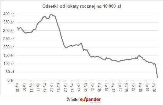 Jednak cięcie stało się konieczne ze względu na problemy gospodarcze spowodowane pandemią koronawirusa. Obniżka stóp to zła wiadomość dla osób posiadających oszczędności. Oprocentowanie lokat spadanie bowiem niemal do zera. - Dla przykładu w Santanderze już wynosi zaledwie 0,01 proc., czyli wpłacając 10 000 zł na rok otrzymamy zaledwie 81 groszy odsetek. Średnie oprocentowanie na całym rynku obniży się zapewne do ok. 0,2 pkt proc. z 1,2 proc. w lutym. Kwota odsetek jaką można uzyskać na przeciętnej rocznej lokacie na kwotę 10 000 zł wyniesie więc 16 zł. Dla porównania, zakładając taką samą lokatę w lutym można było uzyskać 97 zł, a 2012 r. nawet 400 zł – mówi Jarosław Sadowski, główny analityk Expandera.