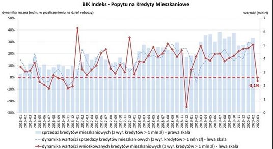 Wartość BIK Indeksu Popytu na Kredyty Mieszkaniowe wyniosła w marcu -3,1 proc. – wynika z danych Biura Informacji Kredytowej. Oznacza to, że w marcu w przeliczeniu na dzień roboczy banki i SKOK-i przesłały do BIK zapytania o kredyty mieszkaniowe na kwotę mniejszą o 3,1 proc. niż rok temu. To spore schłodzenie rozgrzanego rynku kredytów mieszkaniowych: w styczniu i lutym indeks urósł odpowiednio 24,5 proc. i 27,7 proc. W dwucyfrowym tempie rósł także w 2019 r., najlepszym pod względem sprzedaży od dekady.