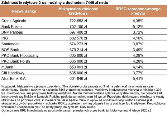 Firma ta co miesiąc ankietuje banki pytające je ile pożyczyłyby trzyosobowej rodzinie, w której oboje rodzice przynoszą do domu po średniej krajowej (bierzemy tu pod uwagę wynagrodzenia w przedsiębiorstwach) i chcieliby zadłużyć się na 30 lat z 20-proc. wkładem własnym. Teraz przyjęto, że rodzina ma do wydania co miesiąc kwotę ponad 7,4 tys. zł netto.