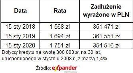 W ostatnich dwóch latach rosły raty kredytów we frankach. W przypadku takiego wypłaconego w styczniu 2008 r. na 300 000 zł i 30 lat, rata dwa lata temu wynosiła 1568 zł, rok temu 1694 zł, a obecnie jest to 1751 zł – wylicza Expander.