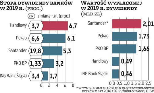 – PKO BP powinien mieć możliwość wypłaty 50 proc. zysku z 2019 r. Do tego dochodzi niepodzielony zysk z 2018 r., czyli 1,6 mld zł, ale zakładam wypłatę połowy tej kwoty ze względu na różne ryzyka w sektorze i potencjalne transakcje M&A – mówi Czajkowska-Bałdyga. Przy takim założeniu i biorąc pod uwagę średnią prognoz zysku netto, PKO BP mógłby w przyszłym roku wypłacić łącznie 2,25 zł na akcję (1,59 zł regularnego zarobku + 0,66 zł z lat ubiegłych), co przy obecnym kursie dałoby 6,4 proc. stopy dywidendy.