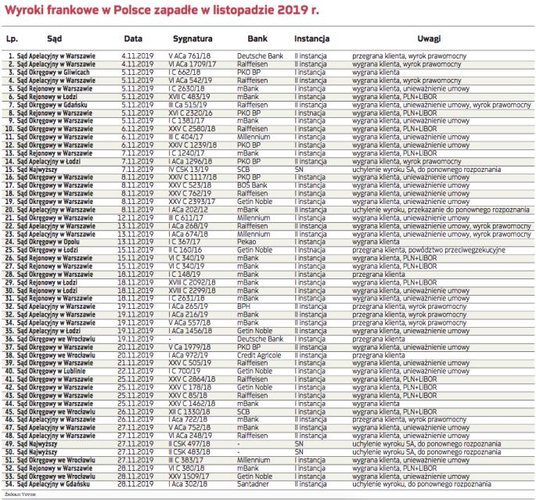 Łącznie w październiku i listopadzie zapadło 85 frankowych wyroków, z czego 70 proc. wygrali klienci (spośród prawomocnych wygrali 60 proc. spraw). W środę Jerzy Bańka, wiceprezes ZBP, mówił, że analiza pierwszych wyroków polskich sądów po orzeczeniu TSUE wskazuje, że koszt, jaki poniosą banki z powodu przegranych spraw, może być niższy niż pierwotnie szacowany przez ZBP 60–80 mld zł. Kluczowe dla łącznego kosztu będzie to, jak sądy będą orzekać, a wciąż pojawia się wiele bardzo rozbieżnych wyroków przy podobnych sprawach, oraz ilu klientów pójdzie do sądów. Zainteresowanie klientów rośnie, na co wskazują dane Votum, największej kancelarii obsługującej frankowiczów. W październiku na fali efektu TSUE do firmy po analizę umów zgłosiło się ponad 8,5 tys. frankowiczów w porównaniu z 4,1 tys. we wrześniu. Liczba zawartych przez Votum umów w segmencie bankowym wyniosła w III kwartale 2,58 tys. wobec 1,55 tys. w II kwartale. IV kwartał zapowiada się również nieźle, bo w samym październiku podpisano 2,42 tys. umów. Spółka ocenia jednak, że październik był pod tym względem wyjątkowy i w listopadzie nie było już tak wielu nowych umów. Kolejna fala możliwa jest w styczniu, gdyby w głośnej sprawie p. Dziubaków Sąd Okręgowy w Warszawie wydał korzystny dla nich wyrok. Do rozprawy, którą zaplanowano na 3 stycznia, włączył się rzecznik praw obywatelskich.