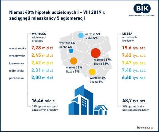 W okresie pierwszych ośmiu miesięcy 2019 r. Polacy zaciągnęli łącznie 159,2 tys. kredytów mieszkaniowych na wartość 42,86 mld zł. Blisko 40 proc. wartości wszystkich udzielonych hipotek „zlokalizowanych" jest na obszarze 5 aglomeracji miejskich – wynika z danych Biura Informacji Kredytowej.