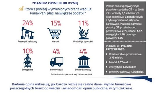 Również porównanie sektora bankowego z innymi branżami pokazuje skalę obciążeń banków. Z niedawno przeprowadzonej przez „Rzeczpospolitą" analizy wynika, iż tylko w 2018 roku sektor bankowy odprowadził ponad 5,5 mld zł z tytułu podatku CIT i był to wynik prawie 1,2 mld zł wyższy niż rok wcześniej. Warto tu zauważyć jednak, że banki odprowadzają do budżetu państwa nie tylko podatek dochodowy od swoich zarobków, ale także tzw. podatek bankowy (liczony od niektórych aktywów). W sumie sięgnął on w zeszłym roku ok. 3,8 mld zł, co oznacza, że to instytucje finansowe są sektorem najbardziej obciążonym daninami dla państwa.