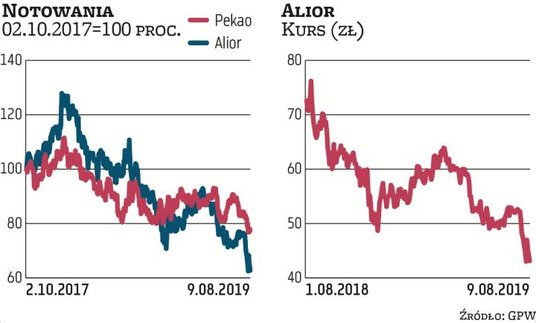 Gdy zapadała ta decyzja, kurs akcji Aliora oscylował wokół 73 zł, dziś jest o ponad 40 proc. niżej (za akcję w piątek płacono 43,1 zł), do czego przyczyniły się problemy z portfelem kredytowym: dużym wzrostem odpisów ze względu na Ruch, a później także ZM Henryk Kania i inne podmioty z segmentu agro. Roczna stopa zwrotu z akcji Pekao również jest ujemna – wynosi ponad -13 proc., za walor płaci się 97,5 zł. Notowania indeksu WIG-banki obniżyły się w tym samym czasie o 10 proc.