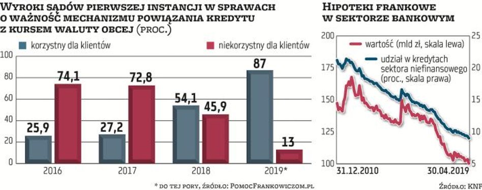 Rośnie nie tylko liczba pozwów, ale także zmienia się linia orzecznictwa sądów na korzyść klientów. Z danych portalu PomocFrankowiczom.pl., prowadzonego przez adwokata Jacka Czabańskiego, wynika, że w tym roku aż 87 proc. wyroków sądów pierwszej instancji w sprawach o ważność mechanizmu powiązania kredytu z kursem waluty było korzystnych w porównaniu z 54 proc. w 2018 r. i po około 25 proc. w latach 2016 i 2017. Analiza powstała na bazie około 300 wyroków.