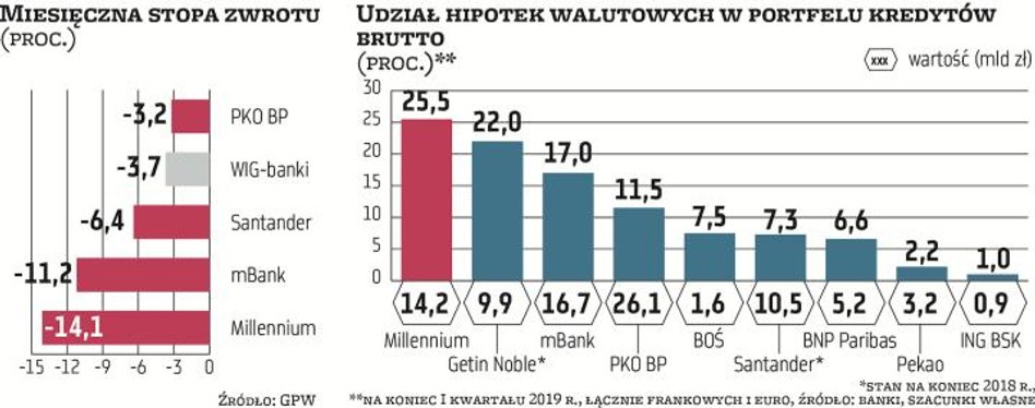 W czwartek notowania akcji mBanku i Millennium, mających największy udział hipotek walutowych, spadały po 4 proc. Przez miesiąc przecena sięga odpowiednio 11 proc. i 14 proc.