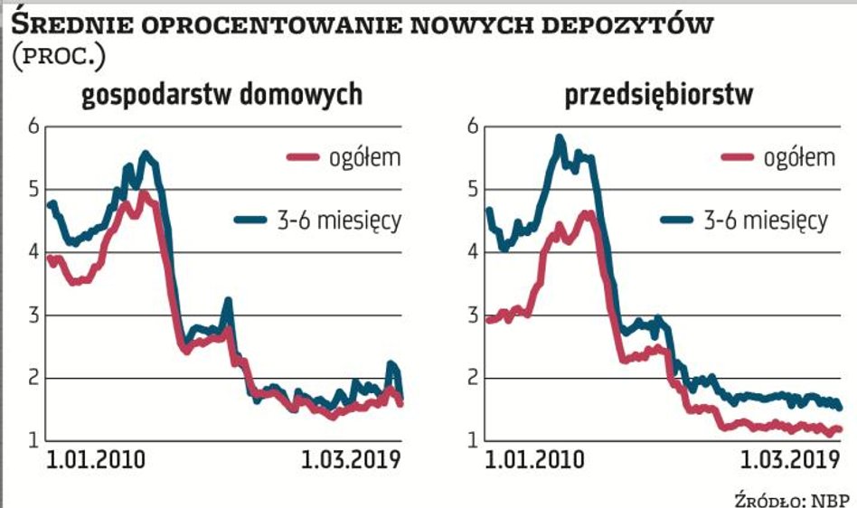 W marcu średnie oprocentowanie nowych lokat dla gospodarstw domowych wynosiło ogółem 1,6 proc., a tych od trzech do sześciu miesięcy – 1,7 proc. W grudniu, styczniu i lutym sięgało odpowiednio ponad 1,8 proc. i 2,2 proc., ale było zaburzone przez Getin Noble i Idea Bank, które po kryzysie płynnościowym z drugiej połowy listopada musiały mocno podnieść ceny lokat i zawyżyło to średnią rynkową. Największe i będące w najlepszej sytuacji płynnościowej banki co najmniej utrzymywały lub lekko zmniejszały koszt finansowania. Lekko spada oprocentowanie nowych lokat dla przedsiębiorstw.