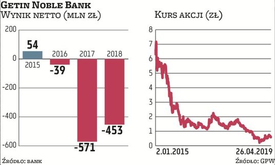 Getin Noble od trzech lat notuje straty. Na początku w 2018 r. zarząd wskazywał, że tym razem powinien być już dodatni wynik, ale bankowi zaszkodziła listopadowa afera KNF, która spowodowała gwałtowny spadek jego płynności i o mało nie doprowadziła do najgorszego, ale też uderzyła w wycenę jego spółek stowarzyszonych, przez co Getin musiał zawiązać dodatkowe odpisy. Ostatecznie w 2018 r. miał ponad 450 mln zł straty netto. W opinii do raportu audytor (firma EY) zaznaczył, że biorąc pod uwagę słabe wyniki, występuje znacząca niepewność, która może budzić poważne wątpliwości co do zdolności banku do kontynuacji działalności.
