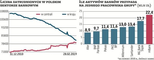 – Pekao dogania resztę sektora pod względem ograniczania zatrudnienia, bo dopiero kończy centralizację działalności back-office, której część wciąż była w oddziałach, co pozwala na zwolnienia – komentuje Andrzej Powierża, analityk DM Citi Handlowego. Zwraca uwagę, że polskie banki wyraźnie różnią się pod względem wskaźników takich jak aktywa w stosunku do liczby oddziałów lub pracowników. Z czołowej ósemki największych w Polsce najlepiej pod tym względem wypadają mBank i ING Bank Śląski, jedne z najbardziej „ucyfrowionych" na naszym rynku. Po drugiej stronie skali są Alior, BNP Paribas, Pekao i PKO BP.
