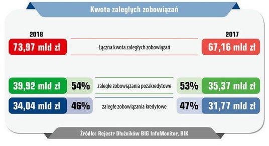 W raporcie mowa o długach przeterminowanych powyżej 30 dni i na co najmniej 200 złotych. Na koniec minionego roku ponad 2, 78mln Polek i Polaków miało problem z terminową spłatą zobowiązań kredytowych i pozakredytowych. Łączna wartość ich zaległych długów wyniosła niemal 74 mld zł. Przez rok, przy uwzględnieniu opóźnień 30-dniowych, liczba dłużników zwiększyła się o blisko 93,8 tys. a kwota zaległości o 6,8 mld zł. To m.in. niespłacane kredyty mieszkaniowe, konsumpcyjne i pożyczki z firm pożyczkowych oraz rachunki za usługi telekomunikacyjne, telewizję kablową, prąd, gaz, czynsz, alimenty, grzywny, kary orzeczone przez sądy, opłaty karne za jazdę bez biletu, a także długi windykowane przez firmy windykacyjne.