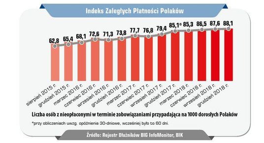 To wyniki najnowszej edycji „InfoDługu", ogólnopolskiego raportu o zaległym zadłużeniu i niesolidnych dłużnikach (dane na koniec 2018 r.), przegotowanego przez BIG InfoMonitor, Indeks Zaległych Płatności Polaków wynosi 88,1 punktów, czyli niemal 9 na 100 dorosłych Polaków nie radzi sobie z terminowym spłacaniem swoich zobowiązań finansowych.