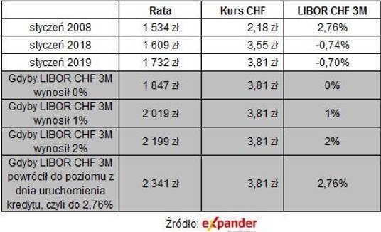 W przypadku kredytów we frankach poziom raty zależy nie tylko od oprocentowania, ale także od kursu walutowego. Ten ostatnio – mimo korzystnego 2018 r. - niestety również nie sprzyja frankowiczom. Przed rokiem kurs CHF wynosił ok. 3,55 zł a obecnie już 3,80 zł. To wszystko sprawia, że rata kredytu na kwotę 300 000 zł na 30 lat, zaciągniętego w styczniu 2008 r. jest o 123 zł wyższa niż przed rokiem (z 1 608 zł do 1 732 zł).