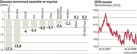 Najmocniej traciły banki Leszka Czarneckiego – Getin Noble i Idea Bank. Kurs tego pierwszego spadał o ponad 17 proc., a drugiego o 15 proc. i ich notowania po południu zostały zawieszone. Te banki taniały już wcześniej i od początku roku ich przecena sięga odpowiednio 80 i 90 proc. Jednak w piątek przyspieszyła rozpoczęta w czwartek przecena innych banków, głównie tych największych i państwowych. PKO BP, lider polskiego sektora, tracił ponad 6 proc., a Pekao, drugi pod względem wielkości aktywów w Polsce, nawet 7 proc. Ich przecenie towarzyszyły wzmożone obroty (odpowiednio 375 mln zł i 255 mln zł w czasie całej sesji). Alior również tracił około 7 proc., ale tu obroty były znacznie mniejsze niż w PKO i Pekao (choć i tak wyższe od średniej).