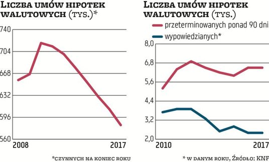 Raport z datą początku czerwca KNF przygotowała w odpowiedzi na interpelację posła Stanisława Tyszki (Kukiz'15) z kwietnia tego roku. W 2017 r. banki wypowiedziały 2,4 tys. umów, co stanowi zaledwie ułamek (0,4 proc.) wszystkich czynnych na koniec roku umów (583,2 tys.). To także tylko część kredytów, które były opóźnione w spłacie – w 2017 r. było ich 5,4 tys. (opóźnienie o 30–90 dni) oraz 6,5 tys. (opóźnienie powyżej 90 dni). W poprzednich latach liczba wypowiedzianych hipotek walutowych również była stosunkowo niewielka – najwięcej wyniosła w latach 2011 i 2012 – po 3,9 tys., ale wtedy ogólna liczba umów była większa (po ok. 700 tys.), więc udział był mały (0,55 proc.).