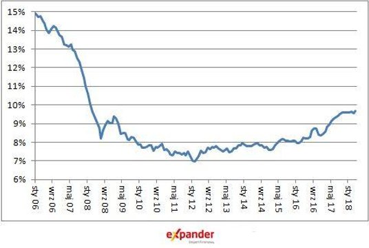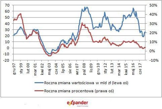 Jego zdaniem wyjaśnieniem tej zagadki nie jest wzrost kwoty oszczędności trzymanej w gotówce. Jej wartość (poza kasami banków) rośnie w ostatnich miesiącach o ok. 7 proc. rocznie. To niewiele. Dla porównania, jeszcze w 2016 r. było to ok. 16 proc. Nic nie wskazuje również na to, że zamiast oszczędzać przejadamy pieniądze. Gdyby tak było szybko powinna rosnąć wartość pieniędzy na kontach i lokatach firm. Te jednak rosną powoli – o 4 proc. rocznie.