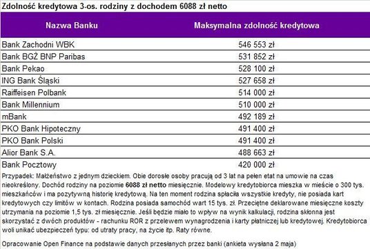 Open Finance wskazuje, że chcąc pożyczyć najwyższą możliwą kwotę modelowa rodzina powinna udać się do BZ WBK, BGŻ BNP Paribas, Pekao lub ING. - Te instytucje deklarują w badanym przypadku chęć pożyczenia ponad 520 tys. złotych. Prawie wszystkie ankietowane instytucje skłonne byłoby zaoferować dług na poziomie około pół miliona wzwyż. Najniższą kwotę hipoteki proponuje Bank Pocztowy, ale i w tym przypadku modelowa rodzina mogłaby liczyć na aż 420 tysięcy złotych. Przy założeniu 20-proc. wkładu własnego oznacza to, że familia zarabiająca dwie średnie krajowe mogłaby wydać na mieszkanie aż 525 tys. zł – mówi Bartosz Turek, analityk Open Finance.