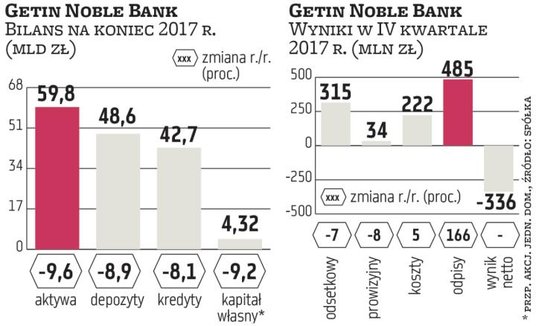 – Osiągnięcie w tym roku rentowności przez Getin Noble Bank to ambitny plan, nawet jeśli odpisy będą rzeczywiście znacznie niższe niż w ubiegłym roku. Bank musi się zmierzyć z malejącym portfelem kredytów i trudno będzie o poprawę marży odsetkowej, co nie wróży dobrze wynikowi odsetkowemu. Poza tym cały czas niski jest wynik z opłat i prowizji, a koszty operacyjne raczej nie zmaleją istotnie, tym bardziej że składka banku na BFG może w tym roku istotnie wzrosnąć – mówi Łukasz Jańczak, analityk Ipopemy Securities.