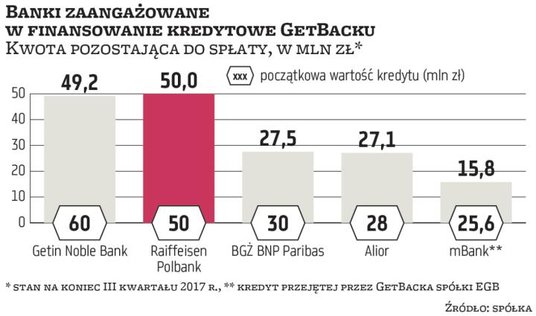Ale rykoszetem, choć w mniejszym stopniu, mogą dostać także banki, które finansowały GetBack. Z prezentacji, do której dotarliśmy, wynika, że w tym roku spółka musi spłacić 61 mln zł kredytów bankowych, zaś w przyszłym – 55 mln zł, a w latach 2020 i 2011 – odpowiednio 24 mln zł i 12 mln zł. Największe ekspozycje kredytowe na koniec września miały Getin Noble Bank (do spłaty pozostało jeszcze 49 mln zł), Raiffeisen Polbank (50 mln zł), BGŻ BNP Paribas (27,5 mln zł), Alior (27,1 mln zł) i mBank (15,8 mln zł, kredyt udzielony jeszcze spółce EGB, którą GetBack przejął). Krótkoterminowe zobowiązania spółki z tytułu kredytów i pożyczek na koniec września były warte 97 mln zł, natomiast długoterminowe – 27 mln zł.