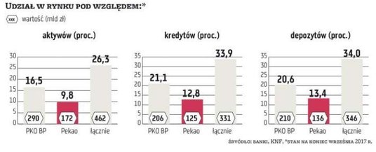 Jak dowiedział się nieoficjalnie „Parkiet" w dwóch różnych źródłach zbliżonych do spółek, celem na przyszły rok jest fuzja obu instytucji. Łączy je główny akcjonariusz, którym jest państwo. W PKO BP ma bezpośrednio 29,4 proc. udziału, w Pekao zaś od czerwca poprzez PZU 20 proc., a przez Polski Fundusz Rozwoju dodatkowe 12,8 proc. kapitału.