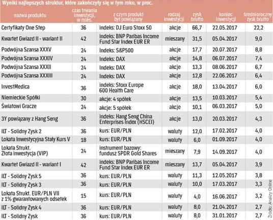 Na najlepszym Certyfikacie One Step oferowanym przez Deutsche Bank i powiązanym z indeksem Euro Stoxx 50 II, można było zyskać w ciągu trzech lat 66,7 proc. brutto, czyli ponad 22 proc. średnio w roku. Wielu tak spektakularnych inwestycji nie ma, ale bardzo dobre wyniki przyniosły również: Kwartet Gwiazd powiązany z BNP Paribas Income Fund Star Index EUR ER (zapisy na ten produkt prowadził Expander) oraz struktury powiązane z indeksami S&P500 i Dax. Niemiecki wskaźnik, obejmujący 30 największych spółek notowanych na giełdzie we Frankfurcie, po wakacyjnej korekcie zaczął odzyskiwać kondycję. Teraz BZ WBK przyjmuje zapisy na lokatę, z której zysk ma zależeć właśnie od frankfurckiego indeksu. Teoretycznie w ciągu dwóch lat będzie można zarobić 16 proc.