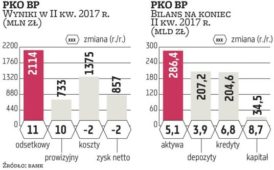 Tegoroczny wynik po sześciu miesiącach jest nieco mniejszy niż rok temu, bo zmieniły się zasady płacenia składek na Bankowy Fundusz Gwarancyjny i płacenia podatku już w pełnym wymiarze (wszedł w życie w lutym 2016 r.). Prawdziwe oblicze wyników PKO BP pokazują wysokie tempo wzrostu dochodów w II kwartale (wynik odsetkowy urósł rok do roku o 11 proc., prowizyjny zaś o 10 proc.) przy jednoczesnym spadku kosztów działania i ryzyka (po 2 proc.). Dzięki temu zysk netto, mimo dużej bazy spowodowanej transakcją z Visą, spadł tylko o 2 proc., do 857 mln zł. Należy jednak pamiętać, że wyniki tym razem wsparła działalność deweloperska (dobra sprzedaż mieszkań przez Qualię) w kwocie 70 mln zł.